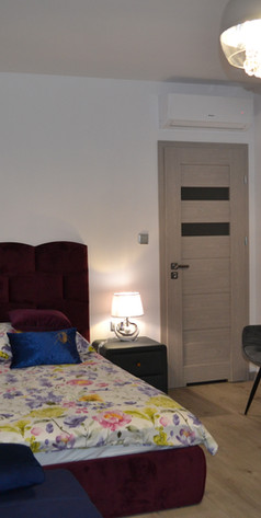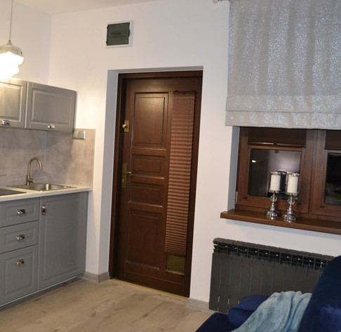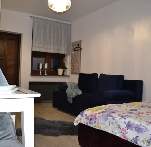 Pokój studio z odzielnym wejściem dla gości wyposażony jest w aneks kuchenny, stół jadalny z krzesłami, komodę, płaski telewizor, wygodne łoże małżeńskie oraz łazienkę z prysznicem. Dodatkowo pokój posiada wygodną rozkładaną kanapę.